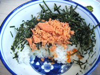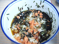 あとはお茶をかけて鮭茶漬けに♪ 朝の胃に優しい食感です。あ、でも本当は胃に負担かけてるのかな(笑)。