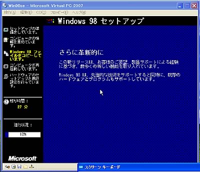 で、調子に乗ってフリーウェアになっている「Virtual PC 2007 for Windows」を落としてインストールです。こいつでWin98seとか動かしたら、95時代の昔のソフトも使えちゃうな〜なんて単純に考えていたんですが、いや〜、はまりました(汗)。