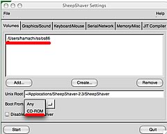 そしてSheepShaver GUIを起動して、まずはインストールするディスクイメージを選択し、BootをCDからするように設定して、