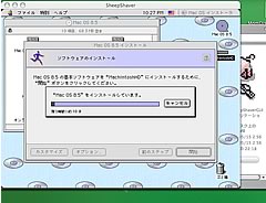 SheepShaverの起動にはX11が必要みたいなので、そいつをインストールDVDから入れてあげます。更に調べると「DarwinPorts」というのも必要みたいです。更に更にインストール後にパッチを当てる必要があるらしく、ターミナルから「cd /opt/local/bin」(optフォルダの中のlocalフォルダの中のbinフォルダへ移動)「sudo sh port -d selfupdate」(rootになってパッチを当てている・・・んだと思います)「sudo sh port install libsdl」(更にrootになってlibsdlをインストールしていると思います)と、まぁおまじないみたいなことをするらしいです。実際には丁寧に解説してくれている方々のページをみていると、こんな手順でやっていらっしゃったので、私も同じようにやっただけです(笑)。