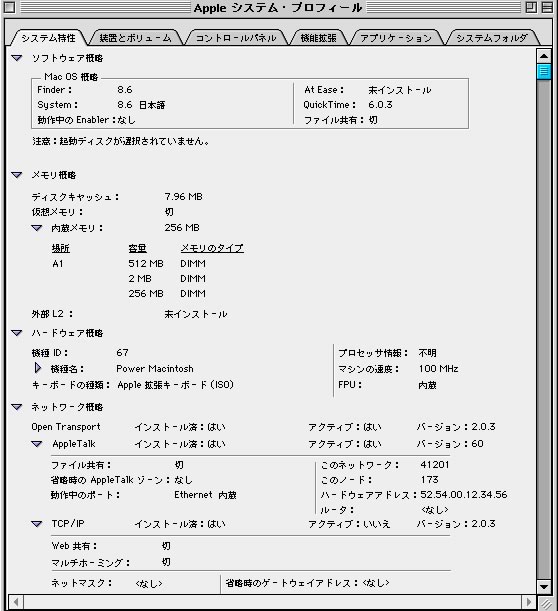 ただし、現状ではシステム的に認識しているデバイスはこれだけですので、USB接続の周辺機器は全く使えません。外付けFDDからHyperCardをインストールしようとしたんですが、全くマウントする気配もありませんでした。ということで、フロッピーのアプリをインストールするためには、いちどOS9のインストールされている実機でディスクイメージ化して、それをCDに焼いて受け渡す必要がありそうです。それはちょっと面倒くさいな〜(笑)。