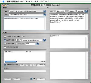 そしてちょっと安心したところで、痒いところに手が届くフリーウェアをインストールしてみました。「携帯動画変換ちゃん」です。Windows使いの方にはもうおなじみ(だと思います)の「携帯動画変換君」のMacバージョンです。DVDが見れて焼けるこのマシンだからこそ、Zaurus用の動画だって簡単に変換できるはず!という甘い考えのもと、これをインストールして挑戦です。とはいえ、すでに携帯動画変換君は使ったことがあるので、使い勝手はほぼ同じな変換ちゃんは快適に設定できて、出来上がりも早い!さすがCore 2 Duo!