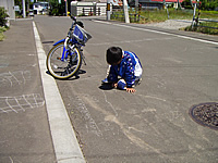 で、「書ける石」を集めてきては、道路にお絵描きです(笑)。実は先週チョークを一箱買ったのですが、その日にほぼ使い切ってしまい、樹理の中で流行っているらしい「道路にお絵描き」ができなかったんです。ということで、町内パトロールの途中であらゆる石を拾ってきては、「書けるかどうか」で選別する毎日です。