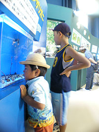 樹理も宏樹も生き物が好きなので、とりあえずは興味津々で水槽を覗き込んでいます。しかしおたる水族館は夏休みで空前の人出です。ショー関連はコミコミで・・・。
