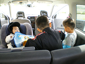 そんなわけで、今日は大通公園にお出かけです。樹凪美の初めての散髪に、大通の丸井今井の床屋さんに行ったんです。もううちの軽自動車Zちゃんの後部席は、子供たちでビチビチです。