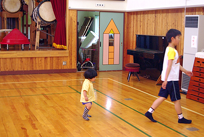 学校ですから、体育館も完備です。体育準備室にはマットや跳び箱やバスケットボールや、ほとんど学校そのもので手つかずの遊び道具が満載です♪