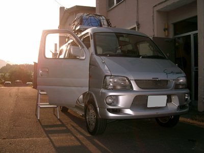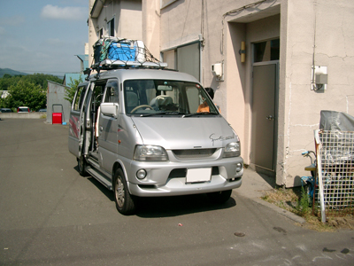 朝、早起きして朝食とお弁当を作り、前の晩に奥さんに詰めてもらった荷物を屋根に上げてネットをし、準備万端で出発です。