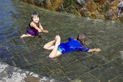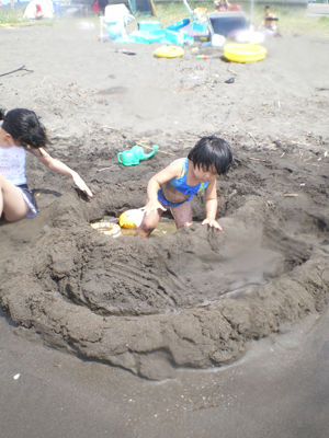 波打ち際に穴を掘ってあげたら、宏樹も樹凪美も喜んで遊んでいます。そういえば私も子供の頃、よく新潟の浜に連れて行ってもらって、こんな風に穴を掘ってもらいました。