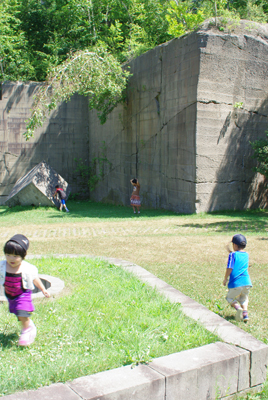 夏らしい暑さと鮮やかな緑、そして雄々しい岩肌が不思議な調和を見せてくれる公園です。子供たちは非日常的な景色に走り回っていました。